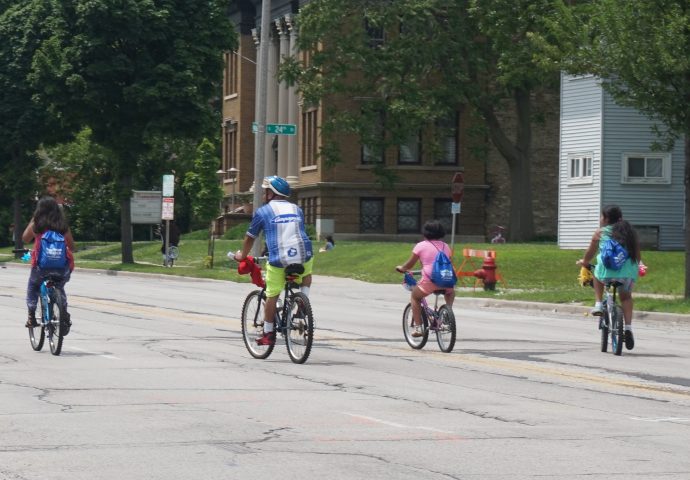 More than a mile of city streets in the Clarke Square neighborhood closed to automobile traffic for Ciclovia MKE on a recent Sunday. Despite the sweltering heat, the streets were filled with opportunities to engage in a variety of sports, games, art and music. Families were able to ride their bikes on automobile-free streets and engage in other outdoor activities along Cesar E. Chavez Drive to National Avenue. The event was held in partnership with the Clarke Square Neighborhood Initiative (CSNI), Safe & Sound, and the Cesar Chavez Drive Business Improvement District, among others.
